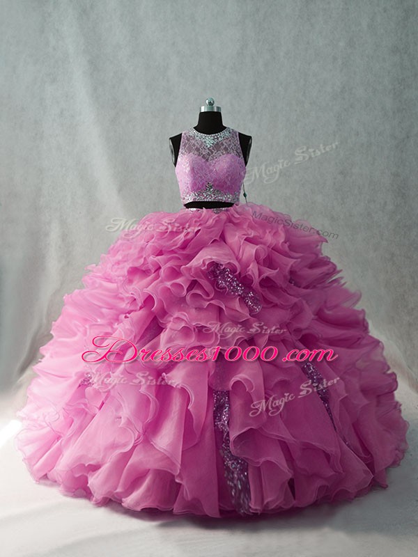 Organza Brush Train Sweet 16 Dresses in Pink with Beading and Ruffles