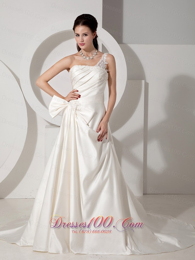 Ivory One Shoulder Ruched Wedding Dress Appliques Court Train