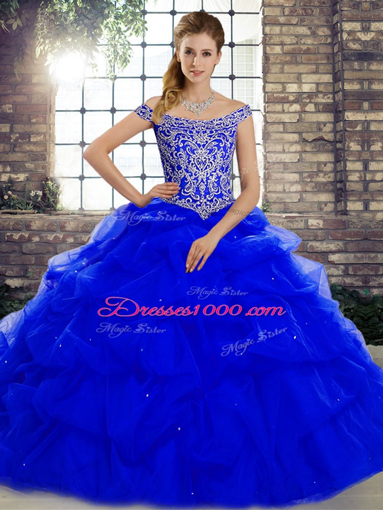 Royal Blue Lace Up Off The Shoulder Beading and Pick Ups Sweet 16 Quinceanera Dress Tulle Sleeveless Brush Train