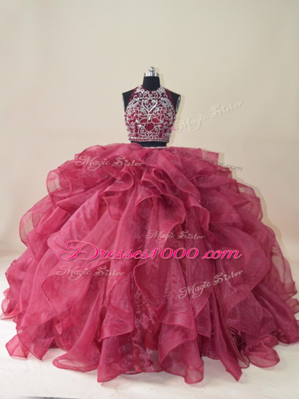 Halter Top Sleeveless Brush Train Backless Quinceanera Gown Burgundy Organza