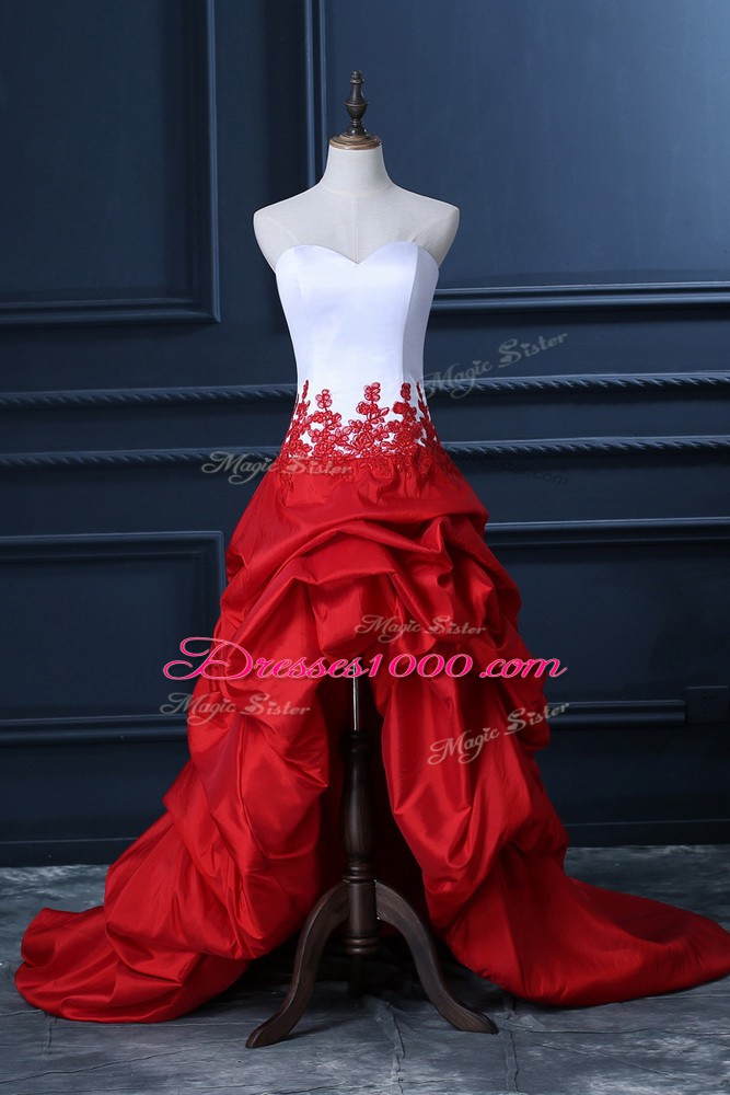 Smart Sleeveless High Low Lace and Appliques and Pick Ups Lace Up Pageant Dress for Teens with White And Red