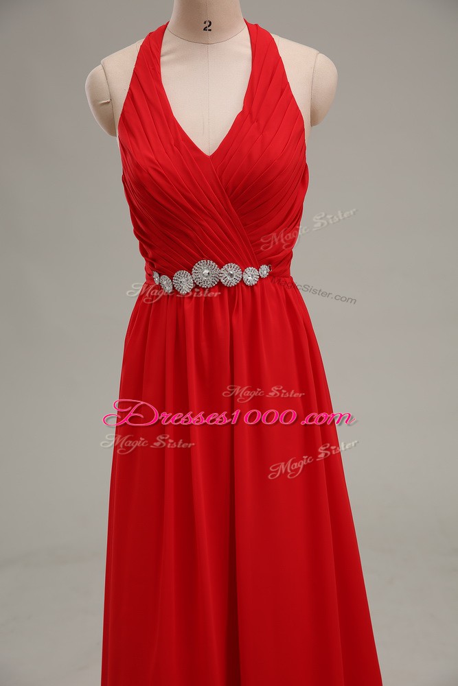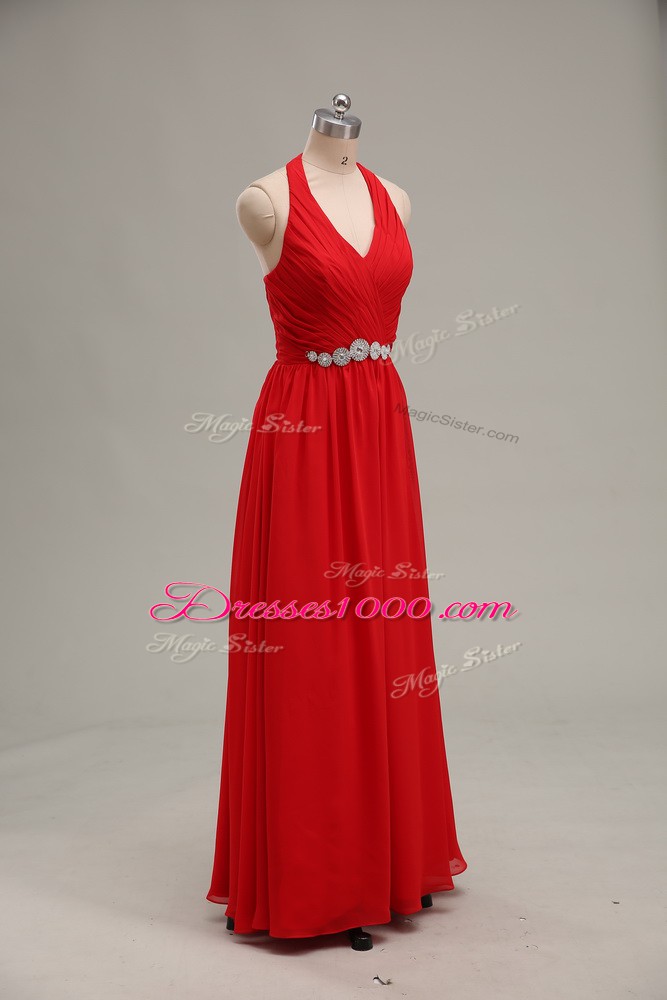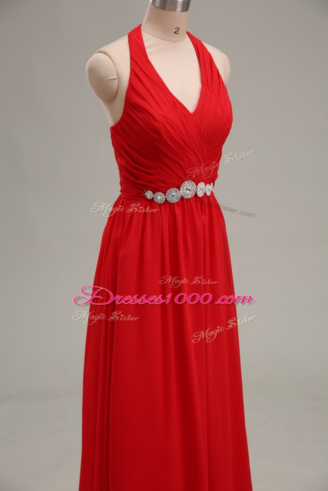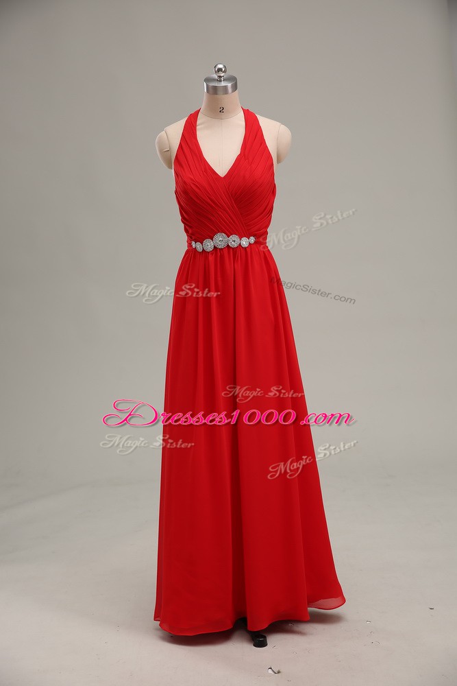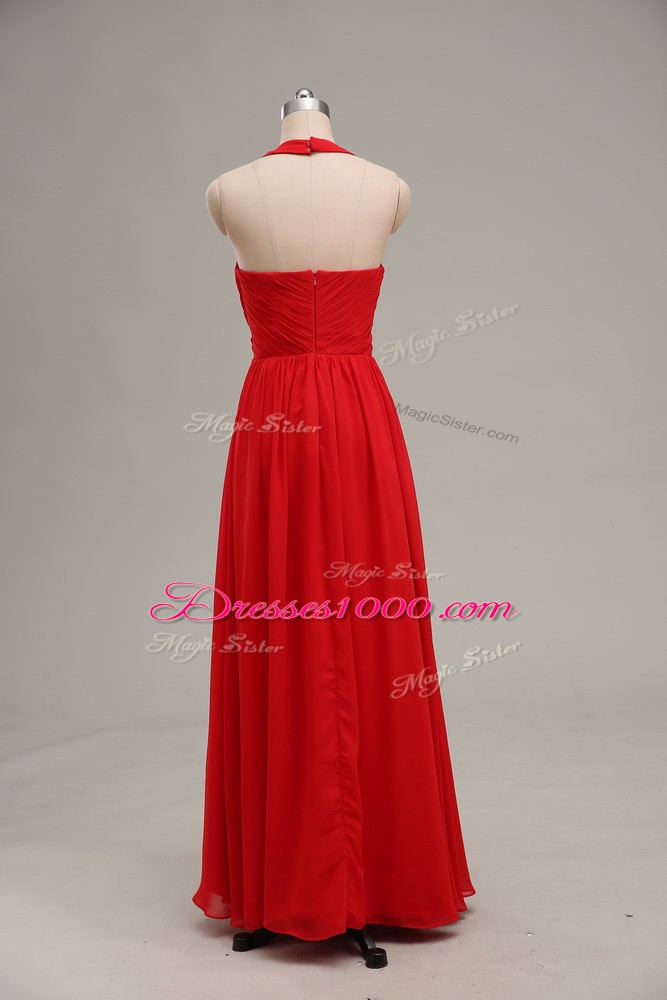 Floor Length Red Evening Dress Halter Top Sleeveless Zipper