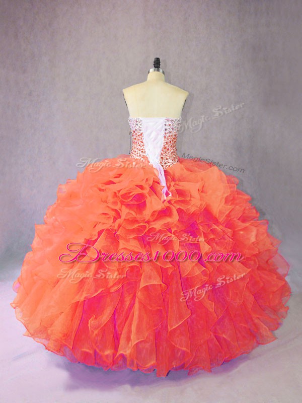 Traditional Orange Sleeveless Floor Length Beading and Ruffles Lace Up Quinceanera Gown