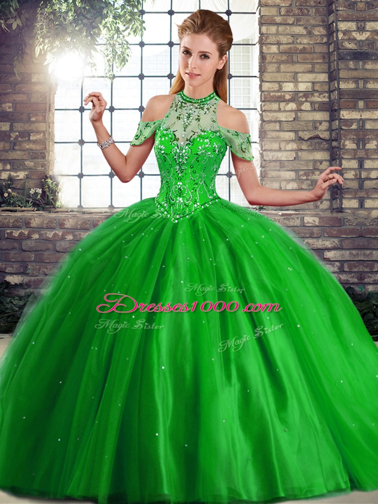 Colorful Green Tulle Lace Up Halter Top Sleeveless 15th Birthday Dress Brush Train Beading