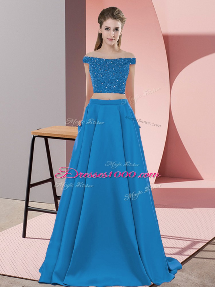 Blue Off The Shoulder Neckline Beading Evening Dresses Sleeveless Backless
