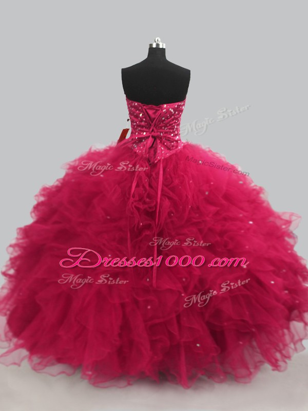 Hot Pink Sweetheart Lace Up Beading and Ruffles Ball Gown Prom Dress Sleeveless