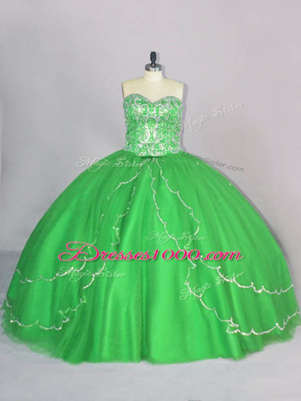 Tulle Lace Up Sweetheart Sleeveless Quince Ball Gowns Brush Train Beading