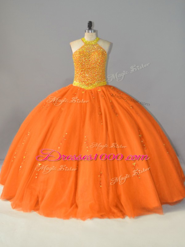 Hot Selling Halter Top Sleeveless Sweet 16 Dress Floor Length Beading Orange Tulle