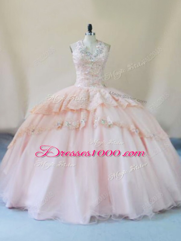Fine Sleeveless Tulle Lace Up Sweet 16 Dresses in Peach with Beading and Lace and Appliques