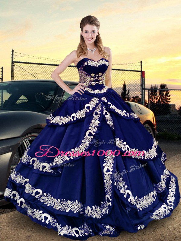 Floor Length Lace Up Quinceanera Gown Royal Blue for Sweet 16 and Quinceanera with Embroidery and Ruffled Layers