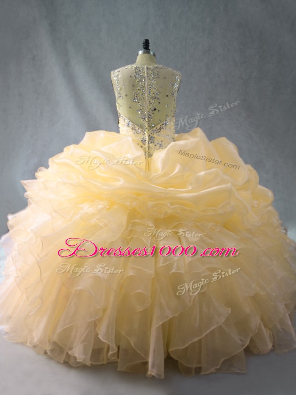 Sleeveless Organza Floor Length Zipper Quinceanera Dress in Gold with Beading and Ruffles