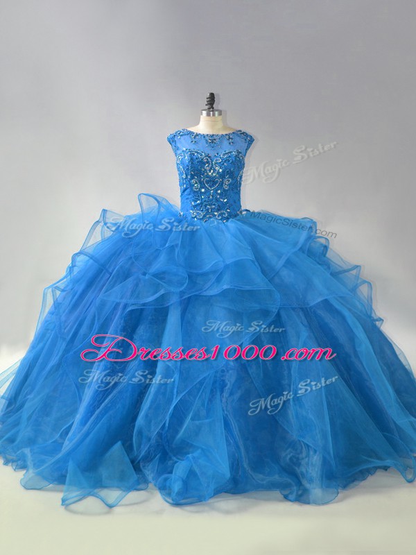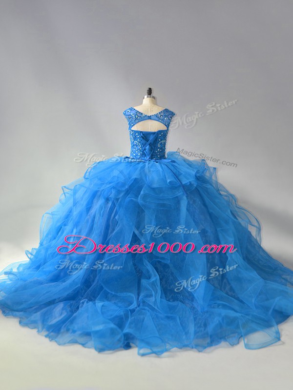 Beading and Ruffles Sweet 16 Quinceanera Dress Blue Lace Up Sleeveless Brush Train