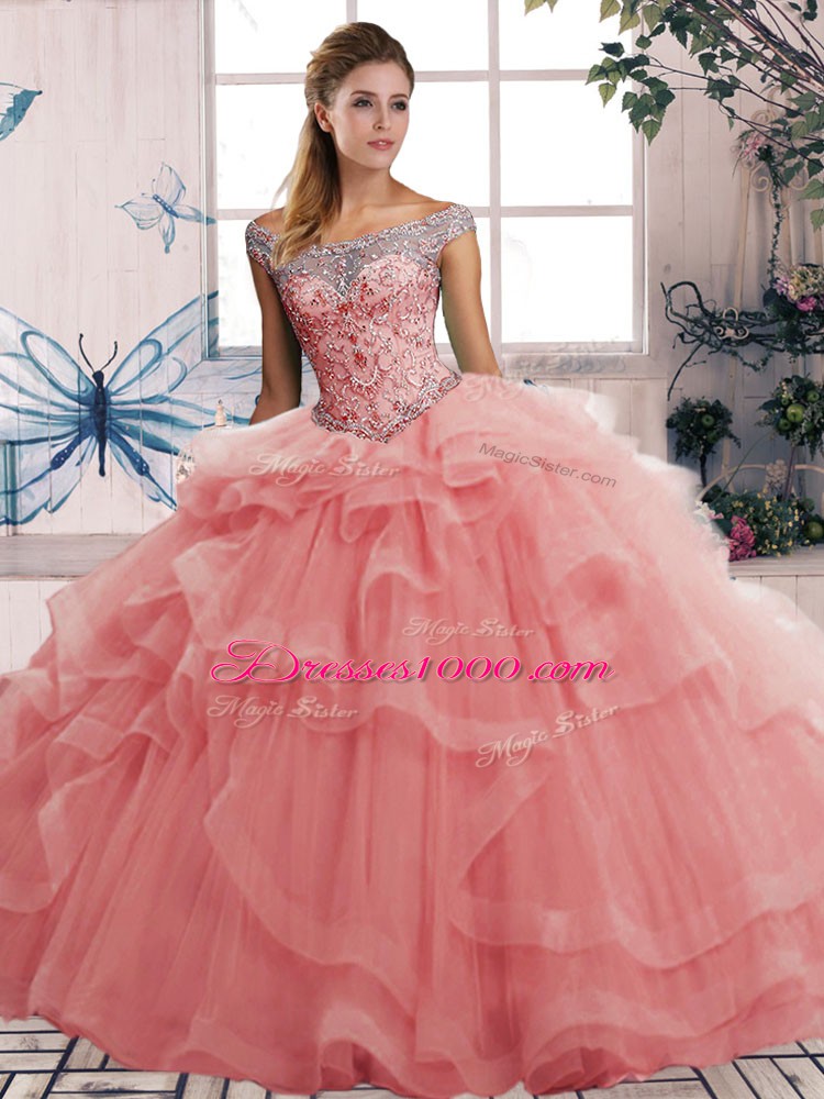 Hot Sale Watermelon Red Off The Shoulder Neckline Beading and Ruffles Sweet 16 Quinceanera Dress Sleeveless Lace Up