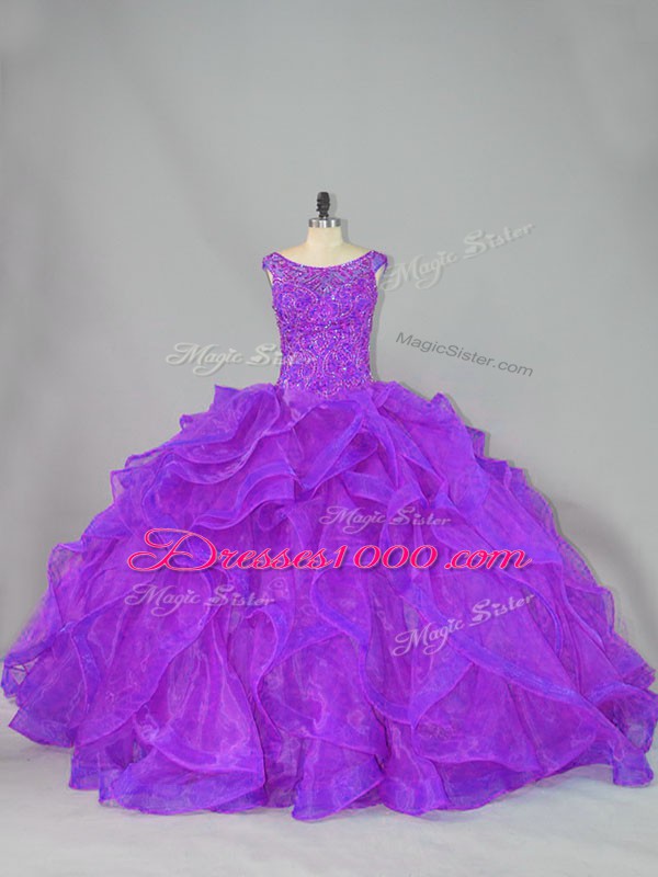 Purple Scoop Lace Up Beading and Ruffles Quinceanera Gowns Brush Train Sleeveless