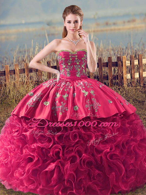 Extravagant Coral Red Sweet 16 Dresses Fabric With Rolling Flowers Sleeveless Embroidery and Ruffles