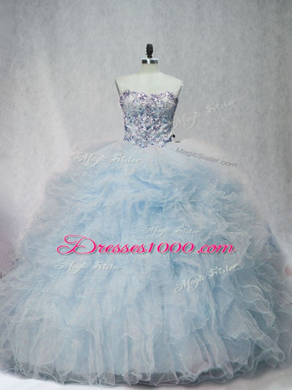 Sweetheart Sleeveless Sweet 16 Quinceanera Dress Brush Train Beading and Ruffles Light Blue Tulle