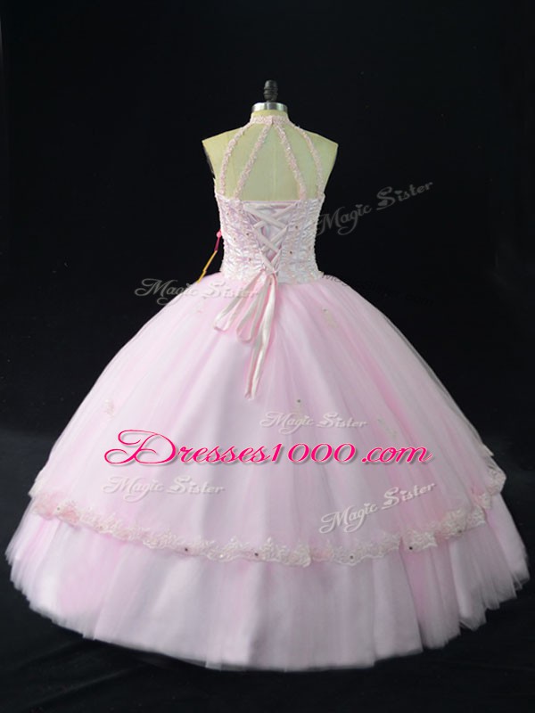 Charming Pink Ball Gowns Tulle Halter Top Sleeveless Beading and Appliques Ball Gown Prom Dress