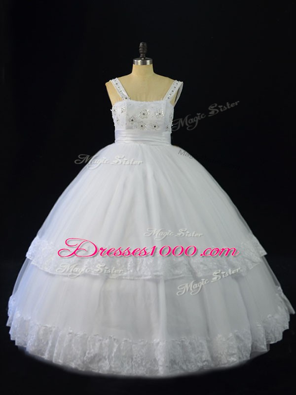 Dazzling White A-line Straps Sleeveless Tulle Floor Length Lace Up Beading and Appliques Quince Ball Gowns