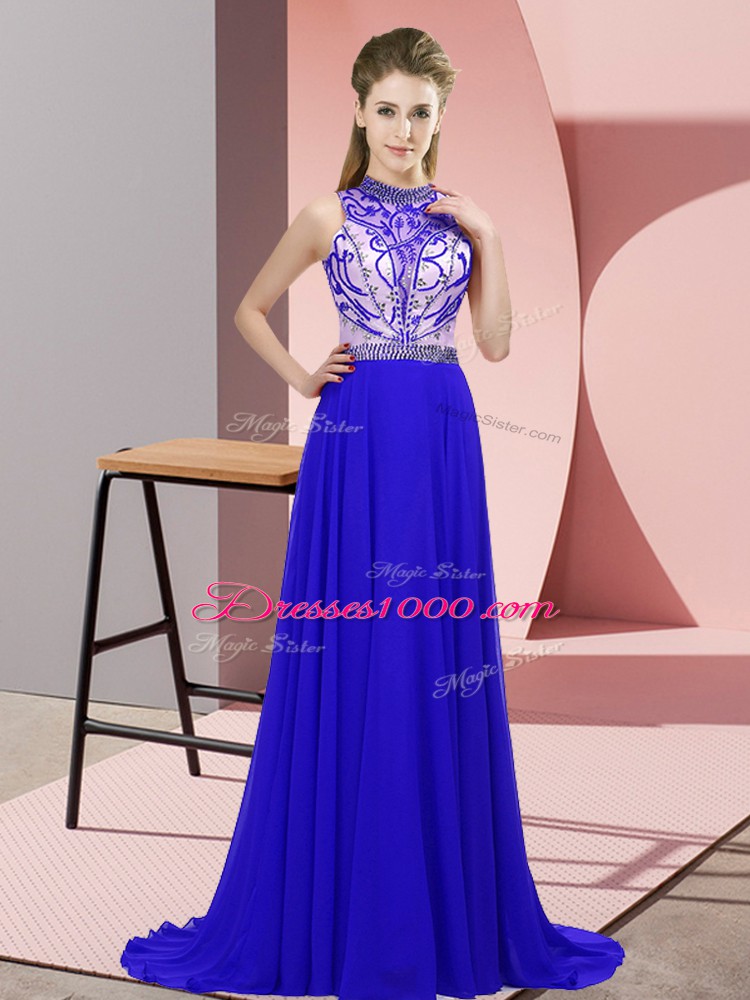 Custom Designed Blue Halter Top Neckline Beading Prom Dresses Sleeveless Backless