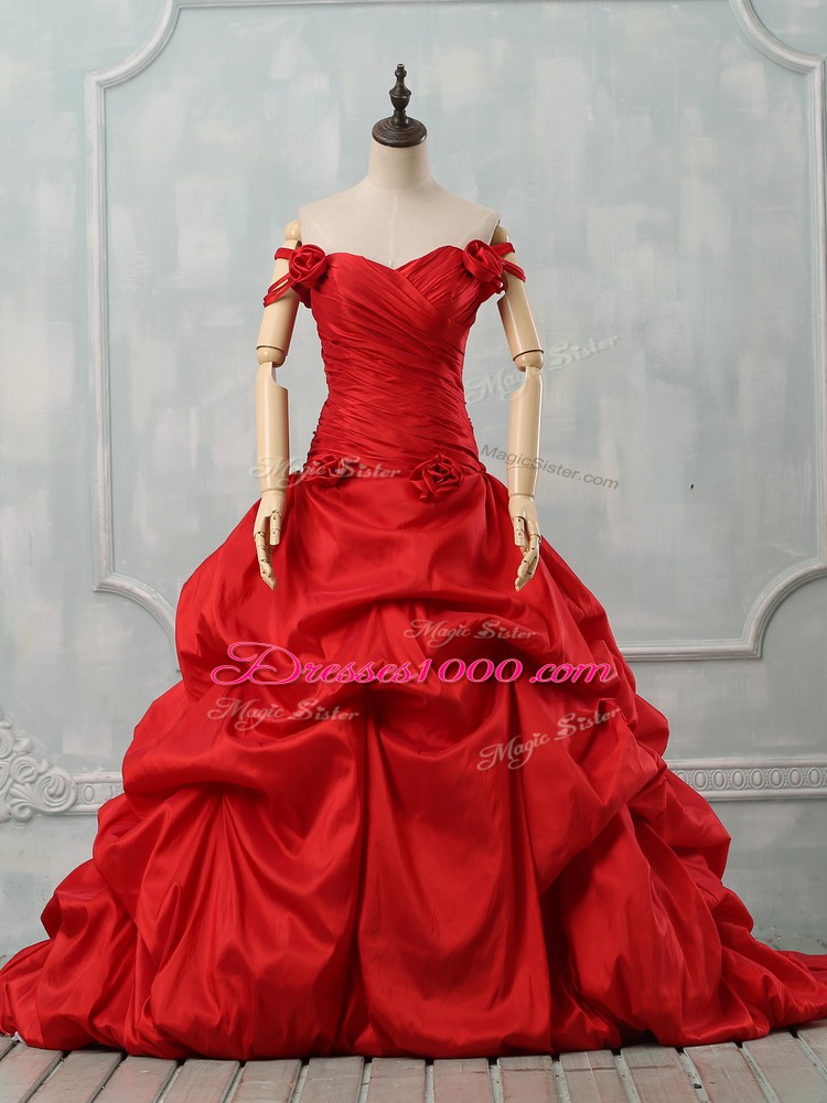 Deluxe Red Taffeta Lace Up Quinceanera Dresses Sleeveless Court Train Pick Ups and Hand Made Flower