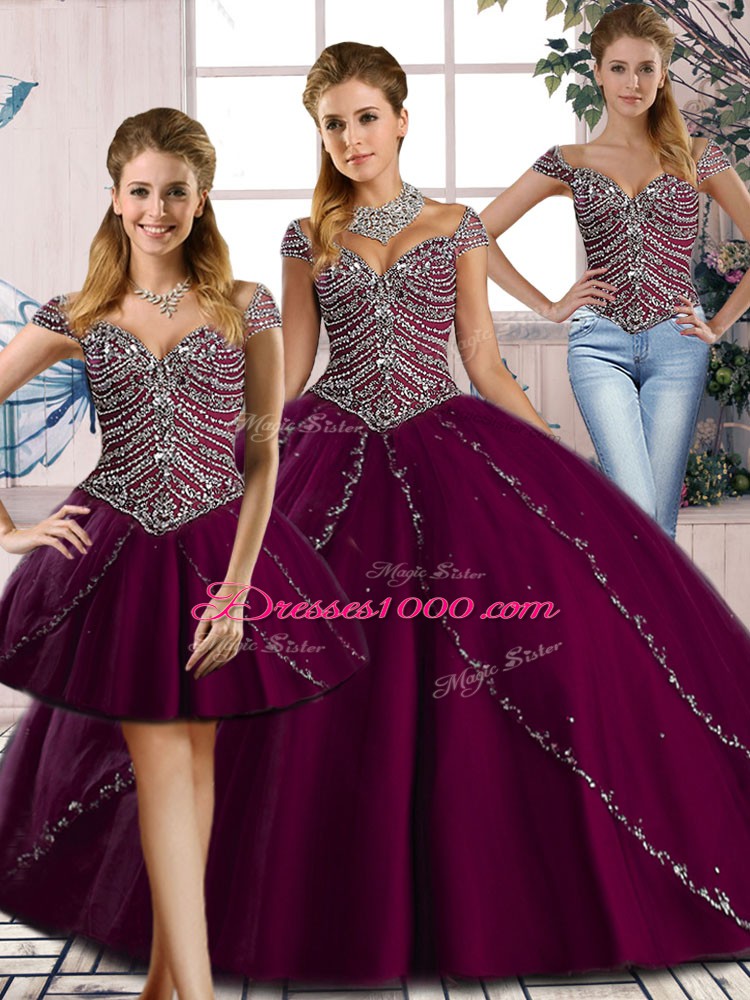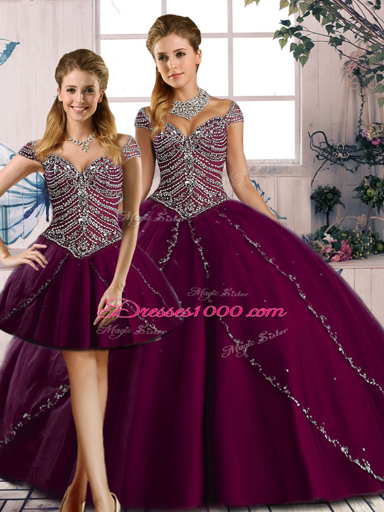 Sweetheart Cap Sleeves Quinceanera Dresses Brush Train Beading Purple Tulle