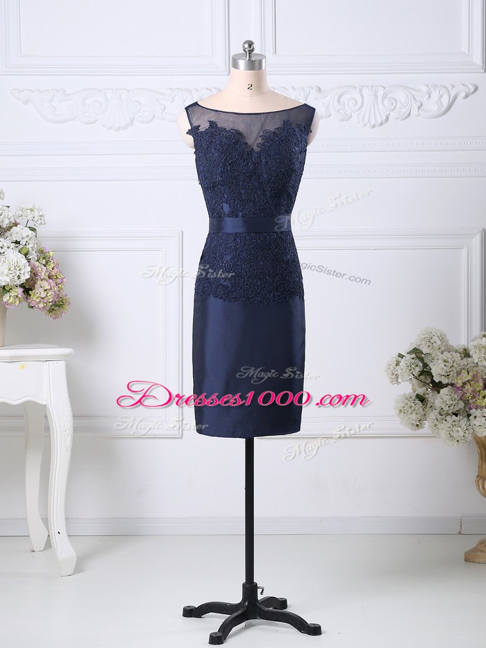 Satin Scoop Sleeveless Zipper Beading and Lace Prom Dresses in Navy Blue