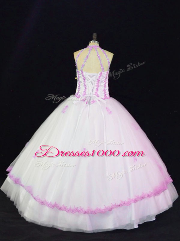 Super White Halter Top Neckline Appliques Ball Gown Prom Dress Sleeveless Lace Up
