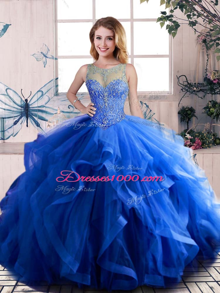 Royal Blue Scoop Lace Up Beading and Ruffles Quinceanera Gowns Sleeveless