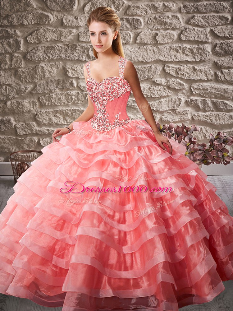Sexy Watermelon Red Ball Gown Prom Dress Straps Sleeveless Court Train Lace Up
