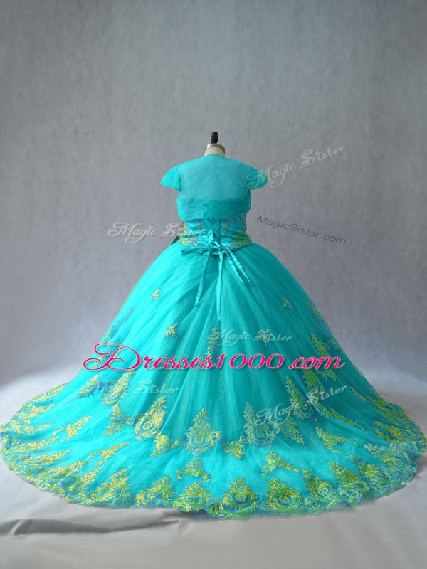 Flare Aqua Blue Ball Gowns Sweetheart Sleeveless Tulle Lace Up Appliques Sweet 16 Dress