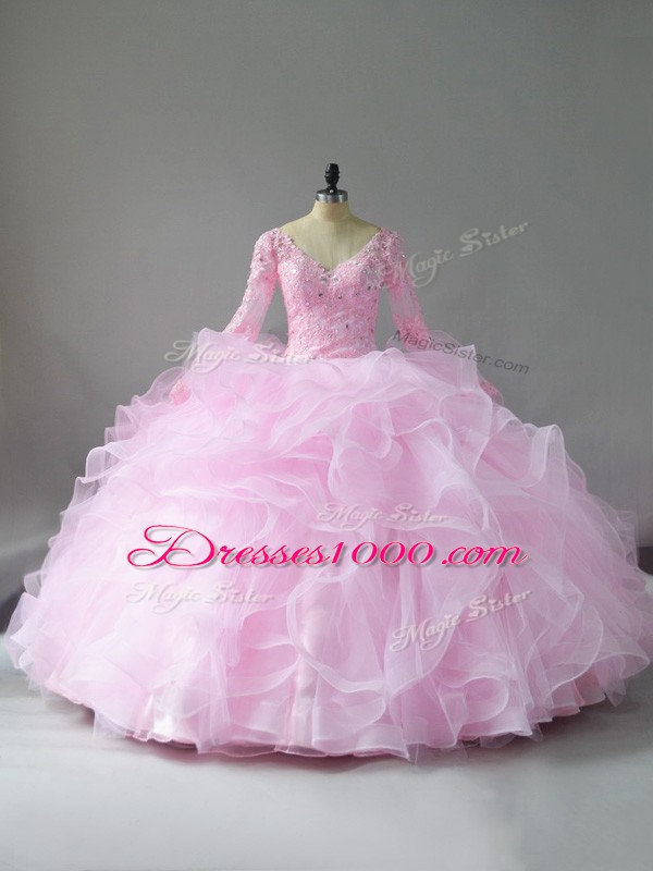 Dazzling Pink Tulle Lace Up V-neck Long Sleeves Floor Length Quinceanera Dresses Lace and Ruffles
