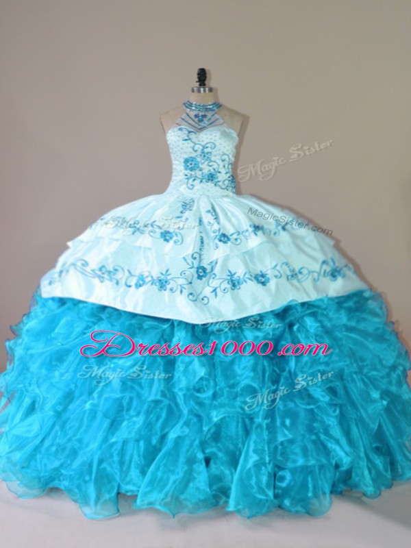 Aqua Blue Organza Lace Up Ball Gown Prom Dress Sleeveless Court Train Embroidery and Ruffles