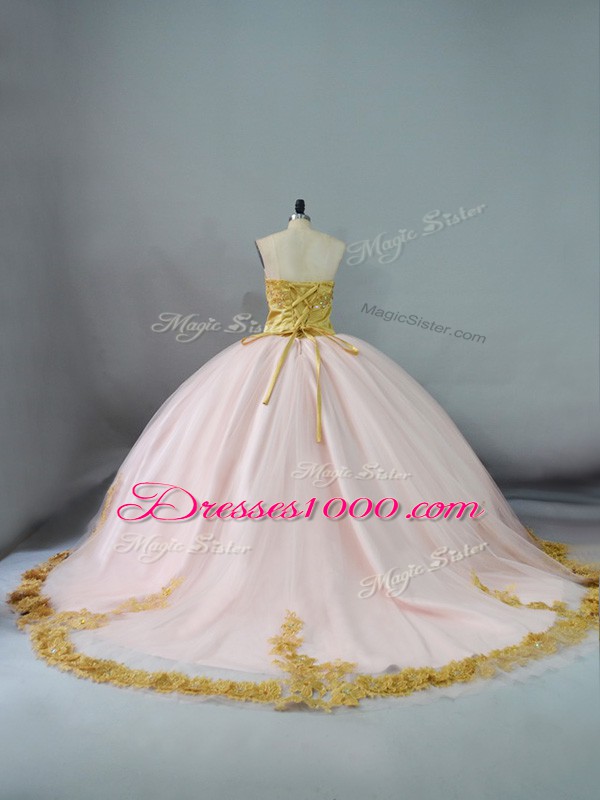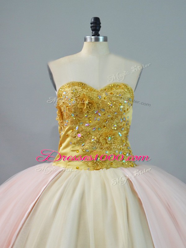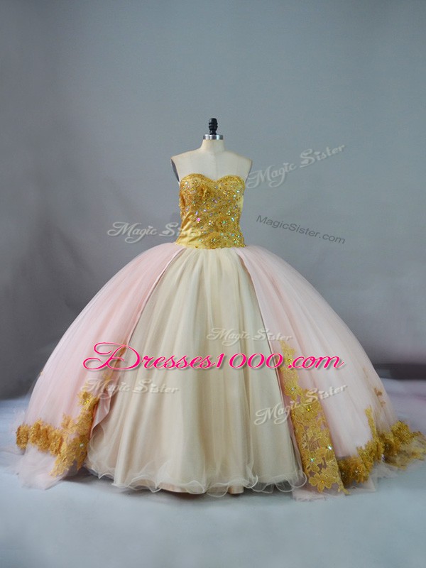 Fabulous Pink and Champagne Ball Gowns Sweetheart Sleeveless Beading and Lace and Appliques Lace Up 15 Quinceanera Dress Brush Train