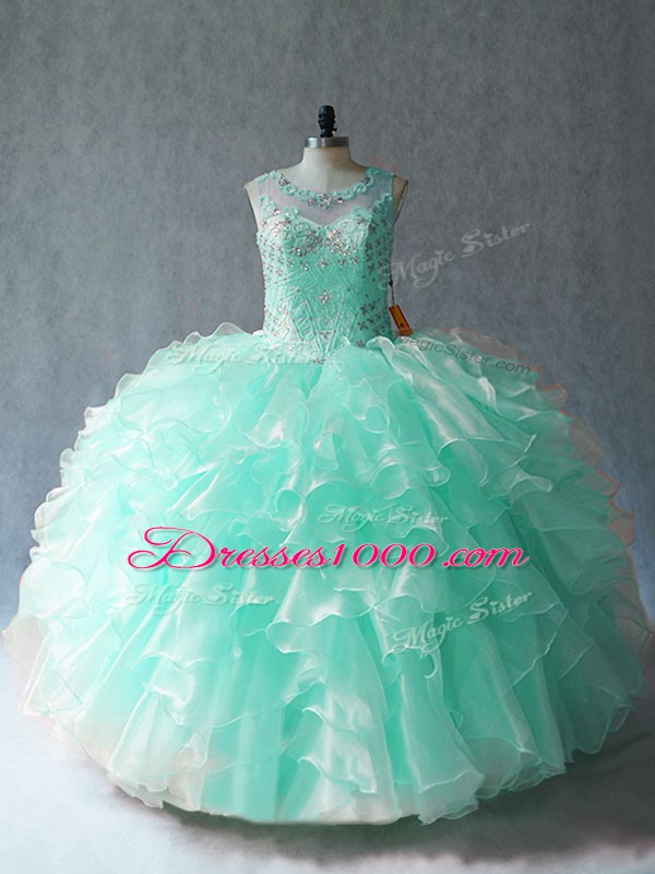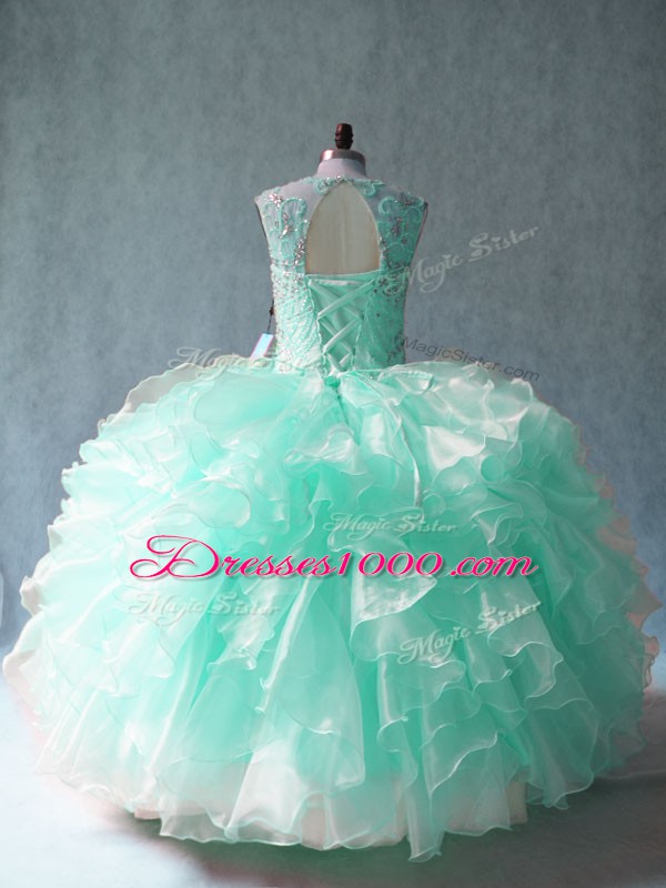 Custom Made Apple Green Ball Gowns Organza Scoop Sleeveless Beading and Ruffles Floor Length Lace Up Quince Ball Gowns