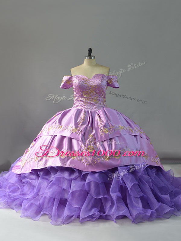 Romantic Lavender Ball Gowns Organza Off The Shoulder Sleeveless Embroidery and Ruffles Lace Up Quinceanera Dress Chapel Train