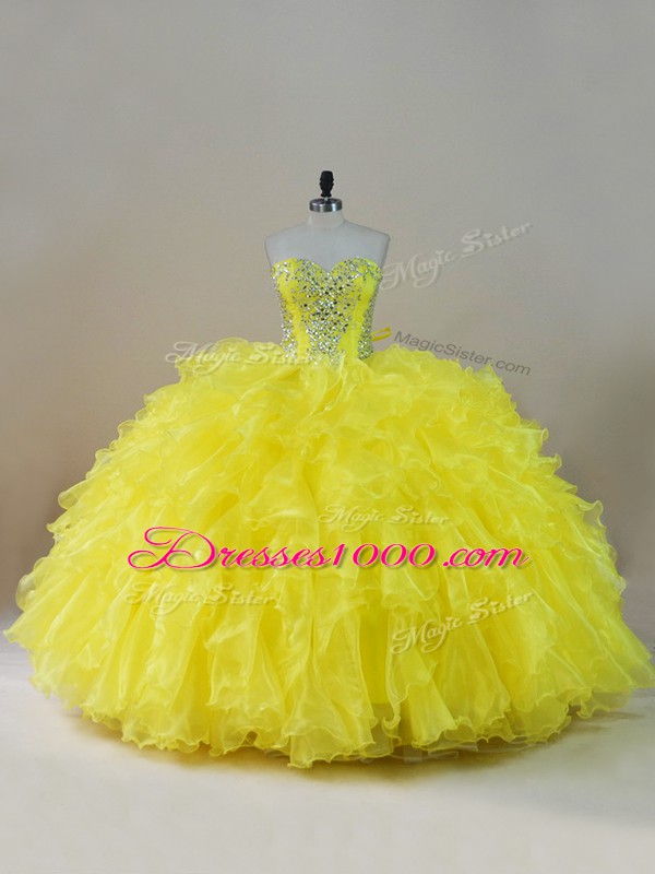 Sumptuous Yellow Organza Lace Up Sweetheart Sleeveless Floor Length Sweet 16 Dresses Beading and Ruffles