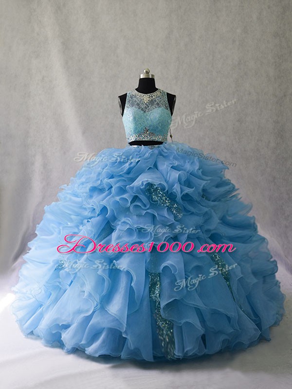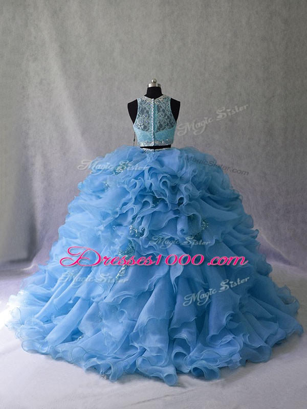 Blue Organza Zipper Scoop Sleeveless Ball Gown Prom Dress Brush Train Beading and Ruffles