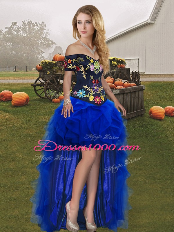 Custom Made A-line Pageant Dress Womens Royal Blue Off The Shoulder Tulle Sleeveless High Low Lace Up