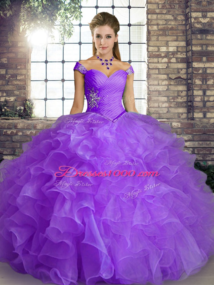 New Style Off The Shoulder Sleeveless Quinceanera Dress Floor Length Beading and Ruffles Lavender Organza