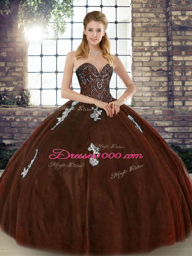 Shining Brown Tulle Lace Up 15th Birthday Dress Sleeveless Floor Length Beading and Appliques