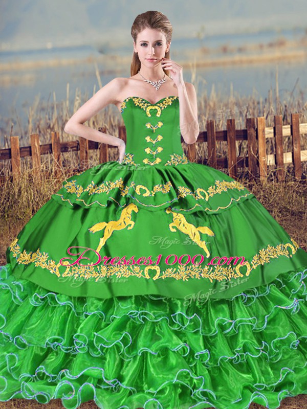 Exquisite Green Lace Up Quinceanera Gowns Embroidery and Ruffled Layers Sleeveless Brush Train