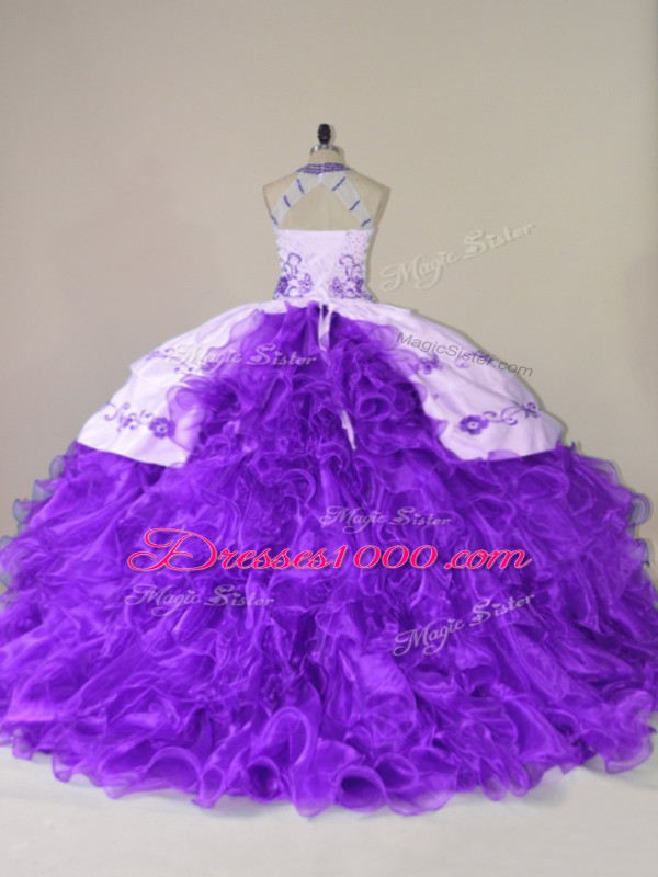 Purple Ball Gowns Halter Top Sleeveless Organza Court Train Lace Up Embroidery and Ruffles Vestidos de Quinceanera
