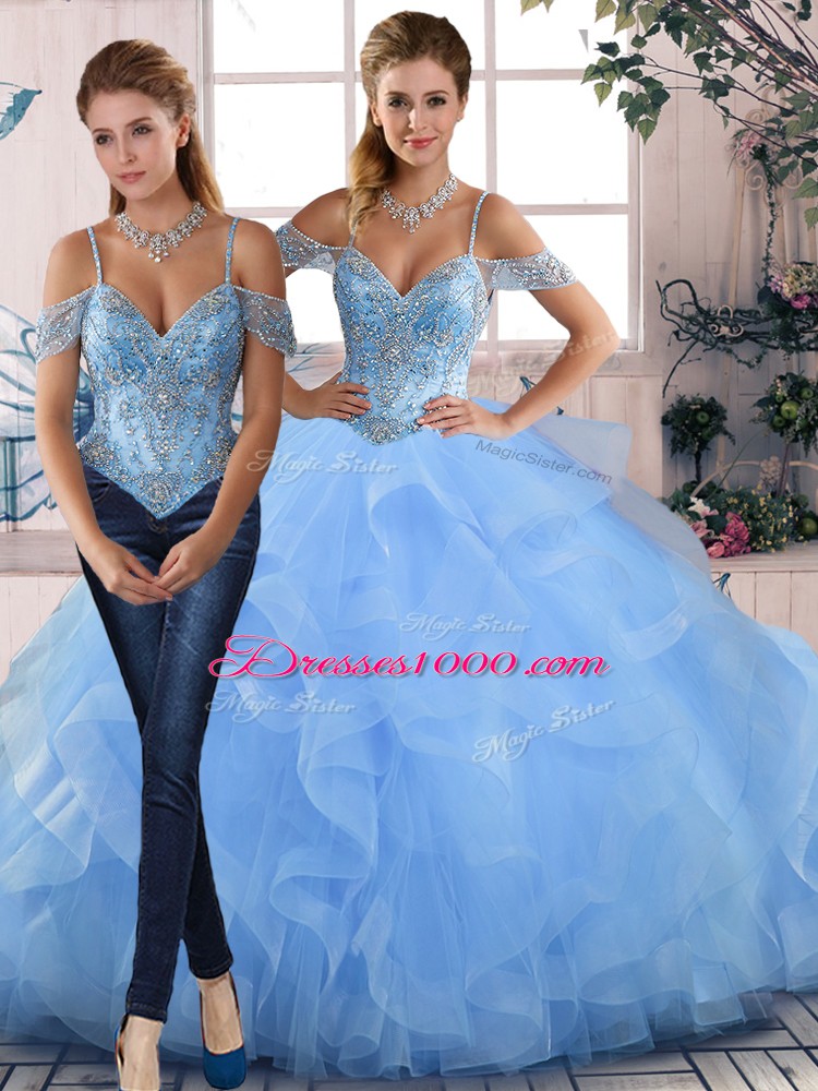 Blue Sleeveless Beading and Ruffles Floor Length Quinceanera Gowns