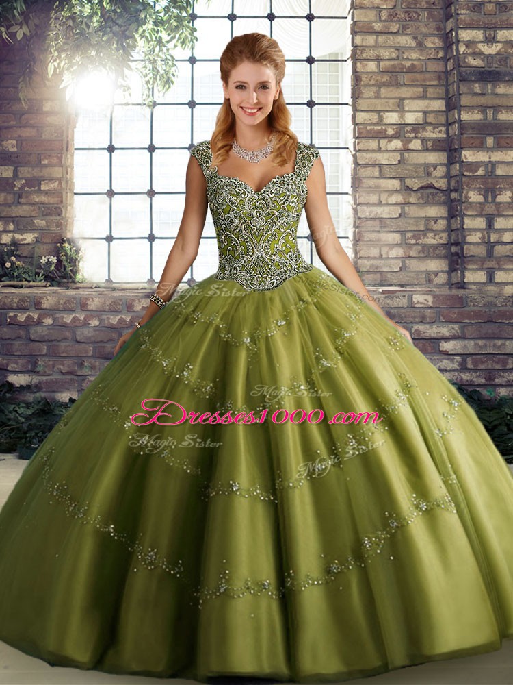 Pretty Olive Green Tulle Lace Up Sweet 16 Dress Sleeveless Floor Length Beading and Appliques