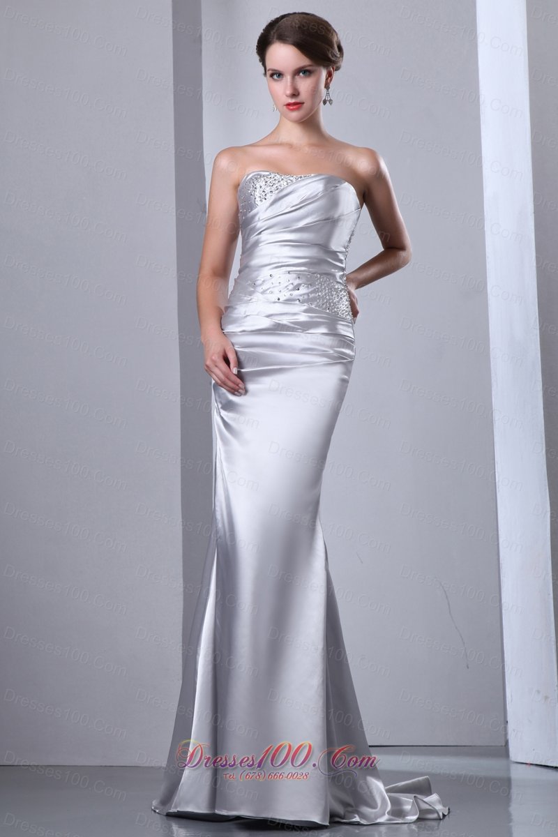 If you're looking to make a lasting impression at your upcoming formal event, this stunning dress can make sure that you do. This gorgeous silver mermaid dress features strapless neckline with ruching and beading in the bodice. The back of this charming mermaid dress has a grace lace up closure and the skirt is complete to an elegent brush train.