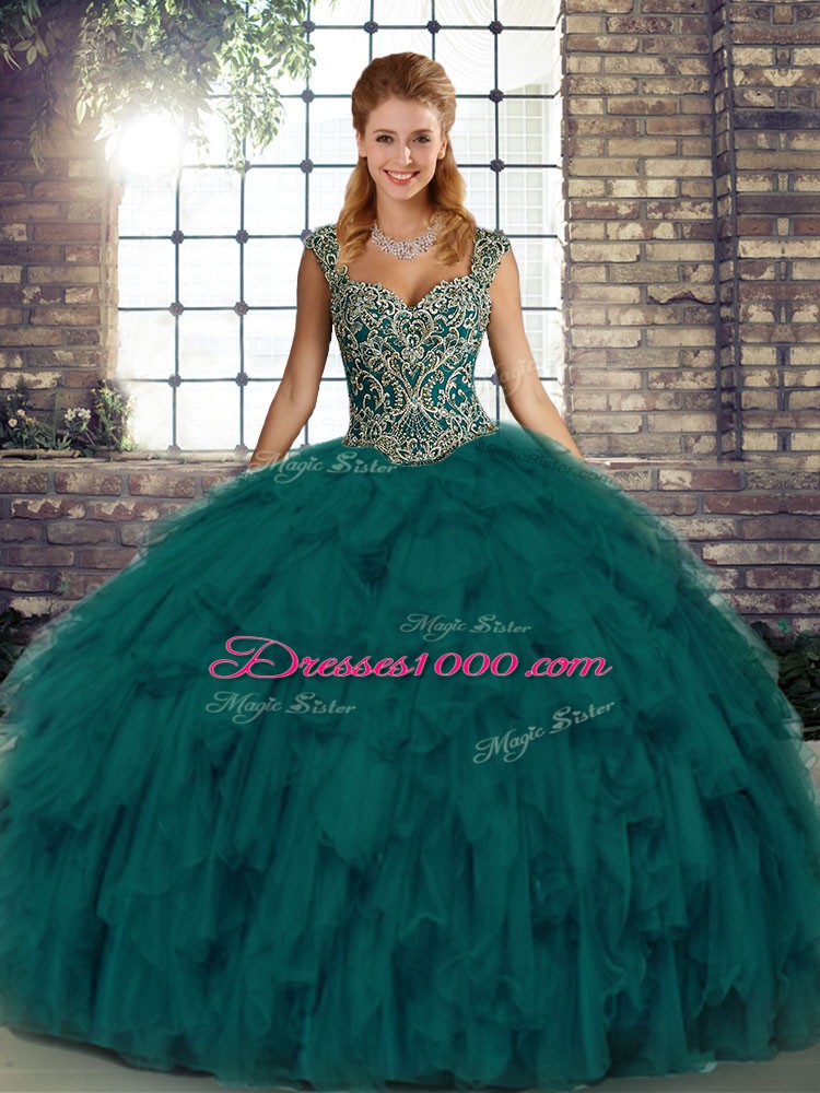 High Class Peacock Green Ball Gowns Straps Sleeveless Organza Floor Length Lace Up Beading and Ruffles Quinceanera Dresses