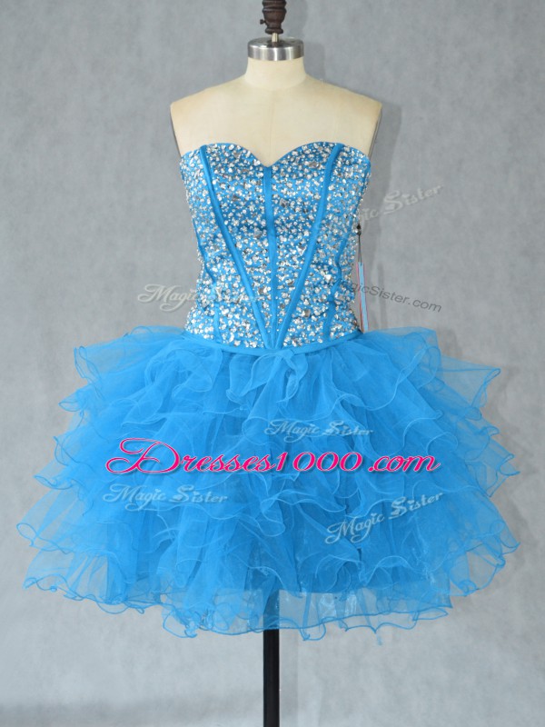 Comfortable Sweetheart Sleeveless Dress for Prom Mini Length Beading and Ruffles Aqua Blue Organza