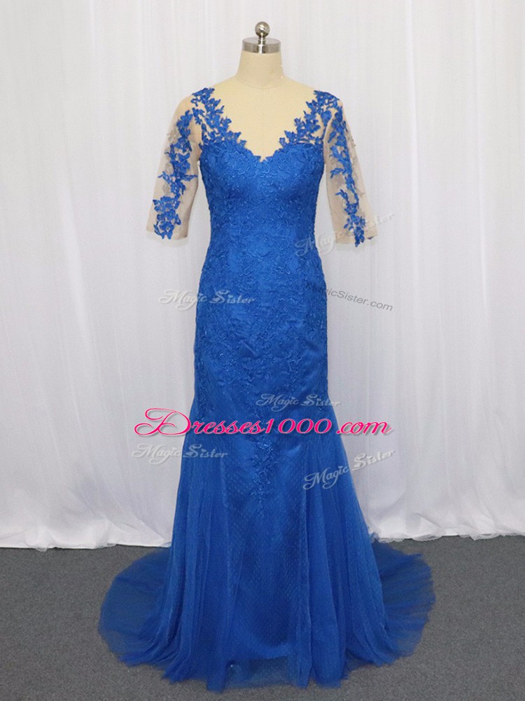 3 4 Length Sleeve Tulle Brush Train Zipper Prom Evening Gown in Blue with Lace and Appliques