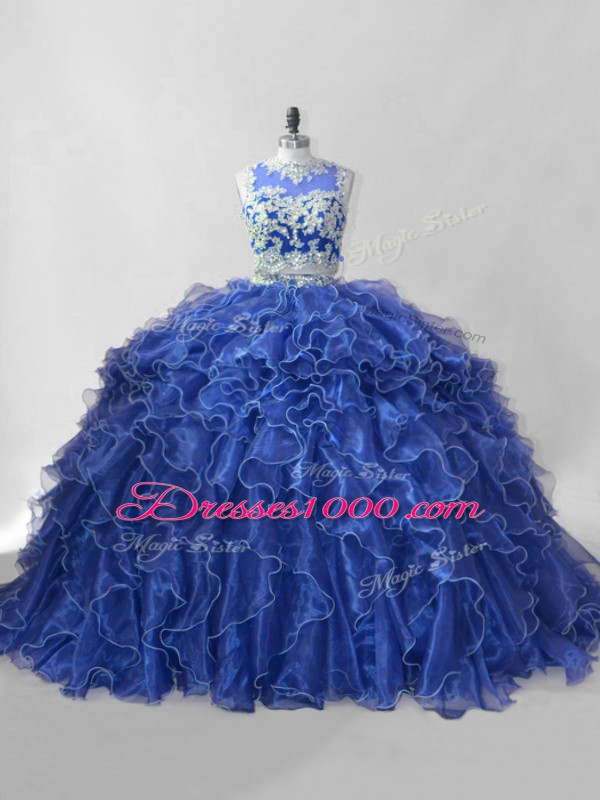 Inexpensive Sleeveless Beading and Ruffles Zipper Quinceanera Gowns with Blue Brush Train