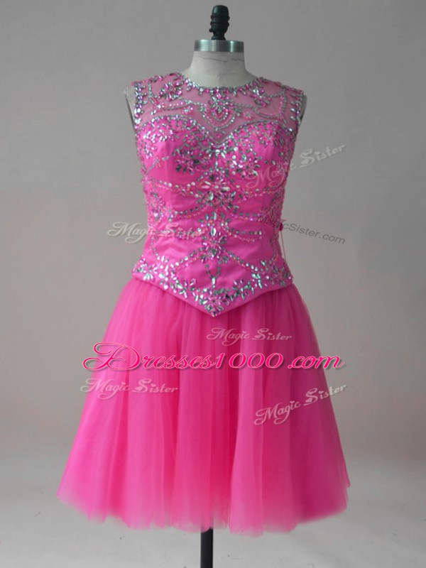 Hot Pink A-line Scoop Sleeveless Tulle Mini Length Lace Up Beading Homecoming Party Dress